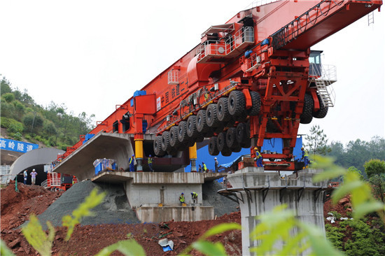 運架一體機自重高達672噸,工作載荷大,是目前較先進的特重型起重設備,采用提梁、運梁、架設三合一模式設計;運架梁作業(yè)時,具有施工速度快,機動靈活,可以在隧道口和隧道內(nèi)零距離架梁,即便是橋隧橋相連的設計形式,即狐貍坑大橋+竹高嶺隧道+燕子巖特大橋這樣的設計形式,也無需拆解任何部件等優(yōu)點。